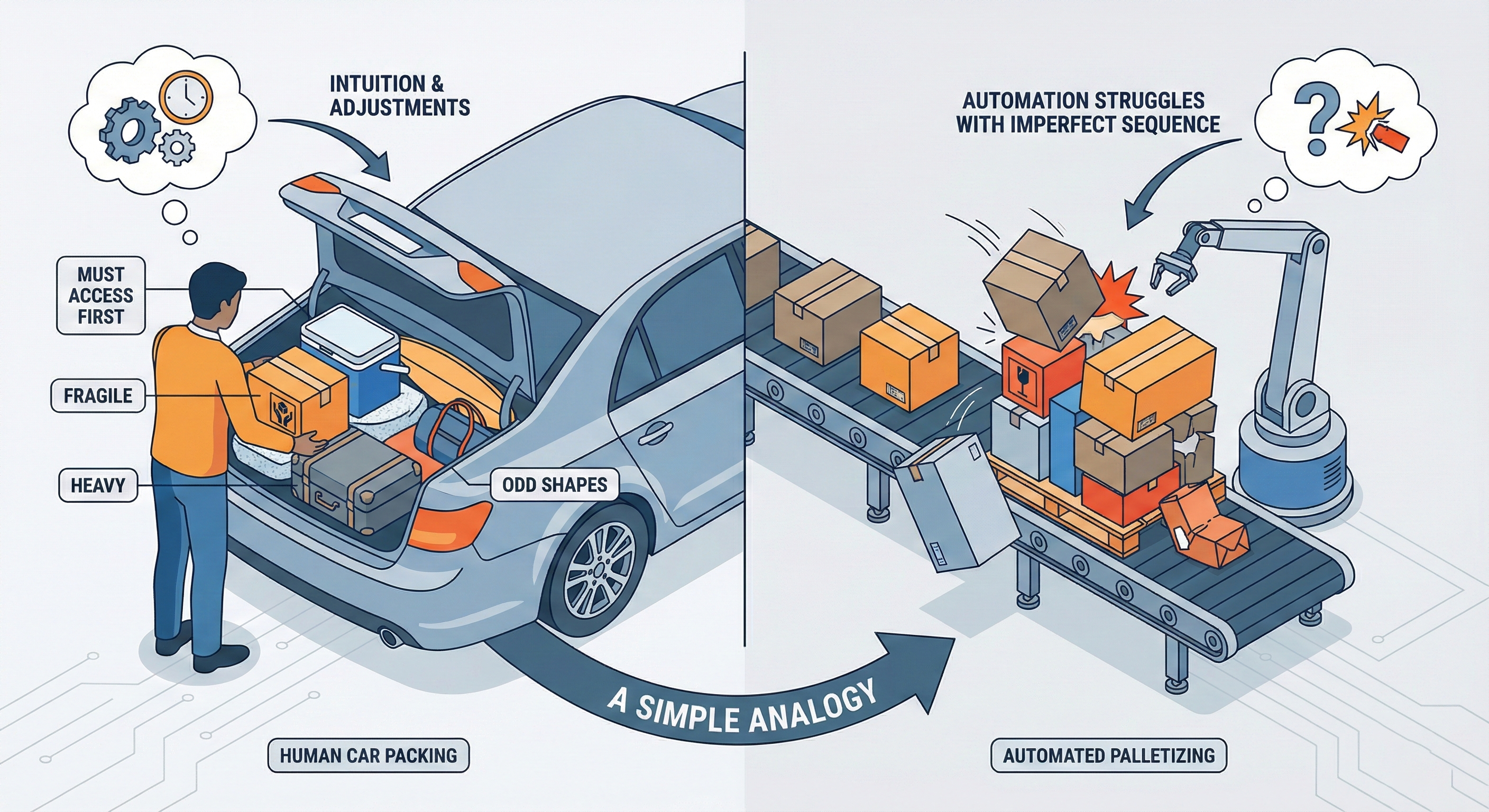 If you have ever packed a car for a long trip, you already understand the essence of mixed-case palletizing. You do not just load items in the order they arrive at the garage door. You constantly trade off constraints: